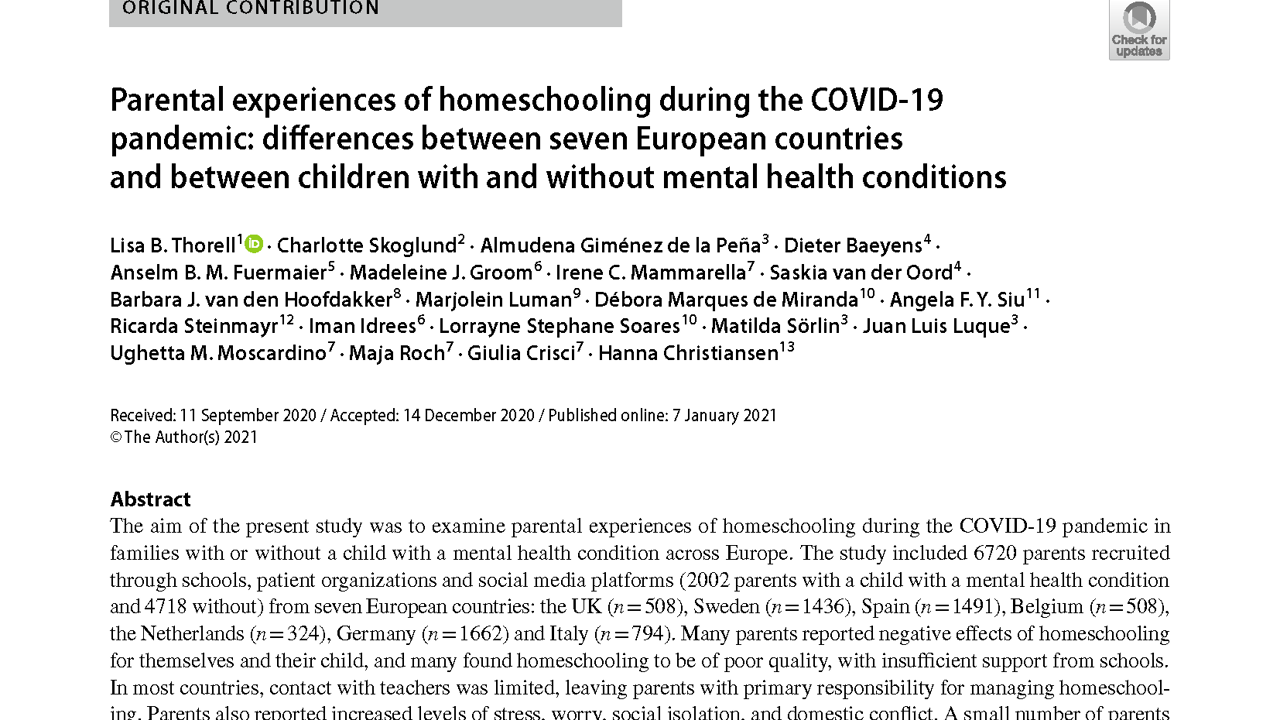 In this multicenter European study, we examined parental experiences of homeschooling during the COVID-19 pandemic in families with or without a child with a mental health condition and concluded that adverse effects of homeschooling may have a long-term impact and contribute to increased inequalities.