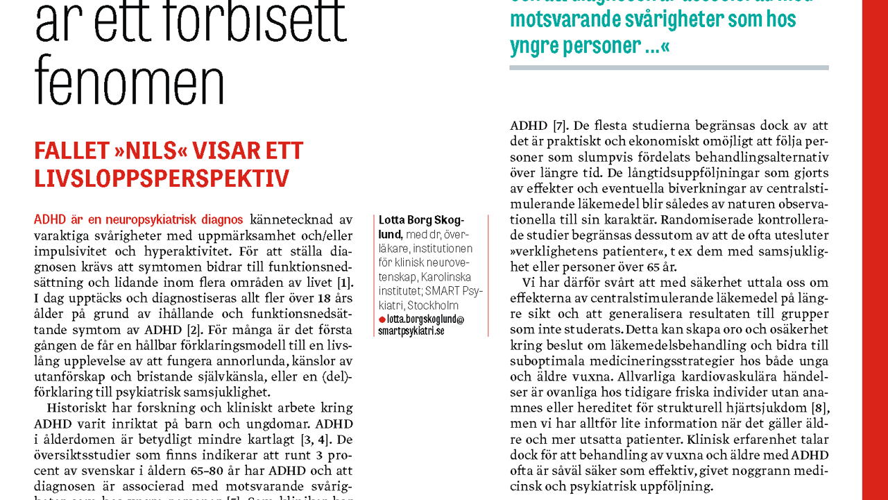 ADHD är en prevalent funktionsnedsättning som ofta inte växer bort i vuxen ålder. Många äldre får kunskap om och förståelse för livslång neuropsykiatrisk sårbarhet när barn eller barnbarn med liknande problematik utreds och diagnostiseras.