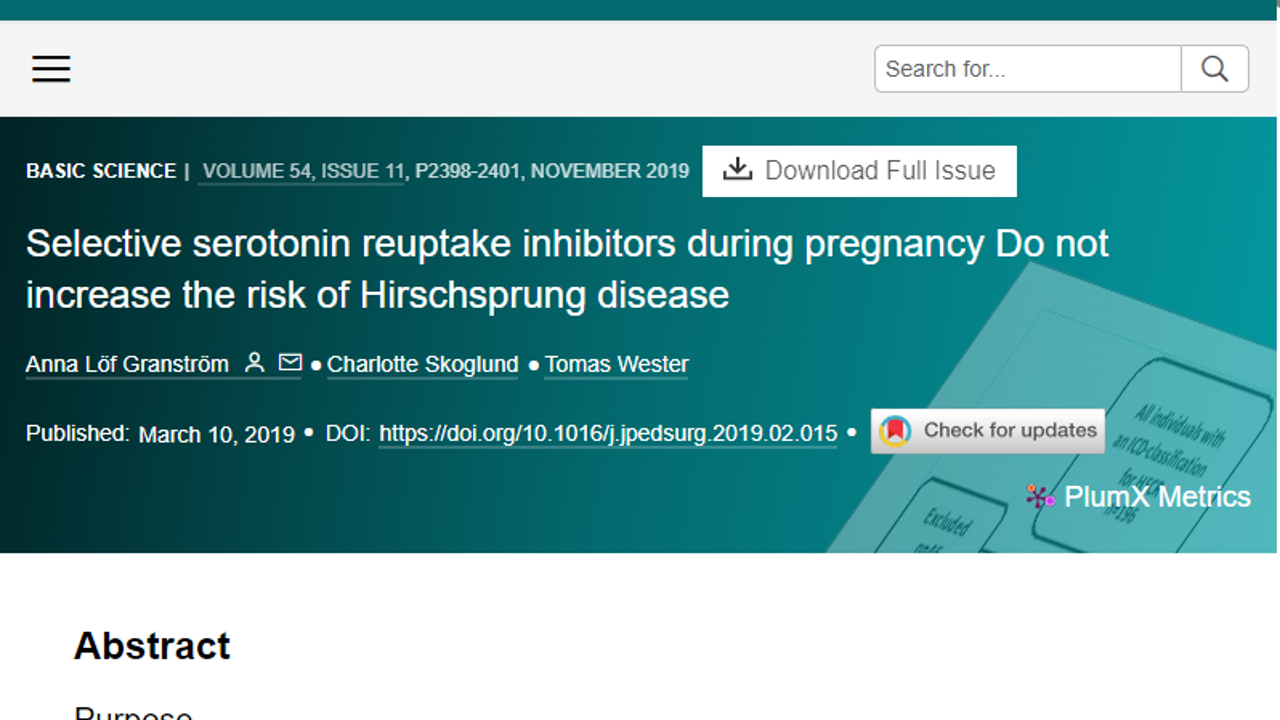 Tidigare studier har visat ett samband mellan SSRI under graviditet och risk för Hirschsprungs sjukdom, men vi kunde inte hitta någon sådan riskökning i vår stora registerstudie.