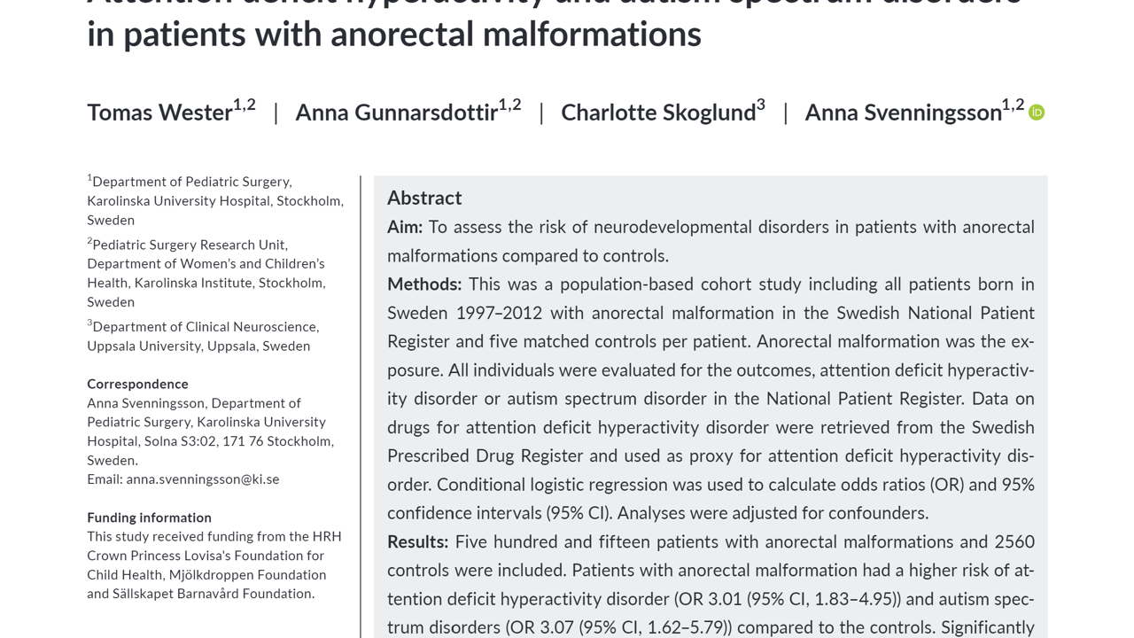 I denna nationella registerstudie visar vi att barn med anorektala missbildningar har en högre risk för ADHD och autismspektrumstörningar jämfört med barn som föds utan missbildningar.
