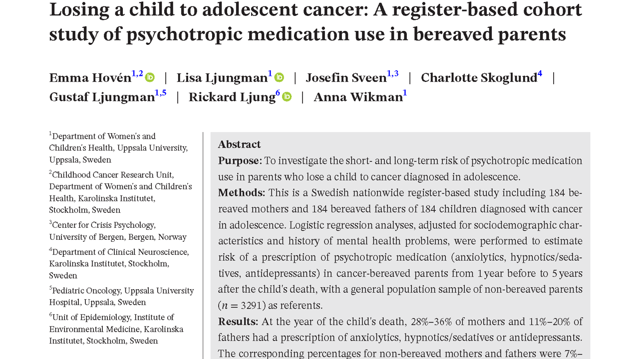 Vi undersökte risken för att behöva medicin hos föräldrar som förlorat ett barn i cancer och fann att de använde mer medicin för psykisk ohälsa. Användningen minskade med tiden, men 5 år efter barnets bortgång använde mammor mer medicin, medan papporna efter 2 år inte skilde sig från andra föräldrar.